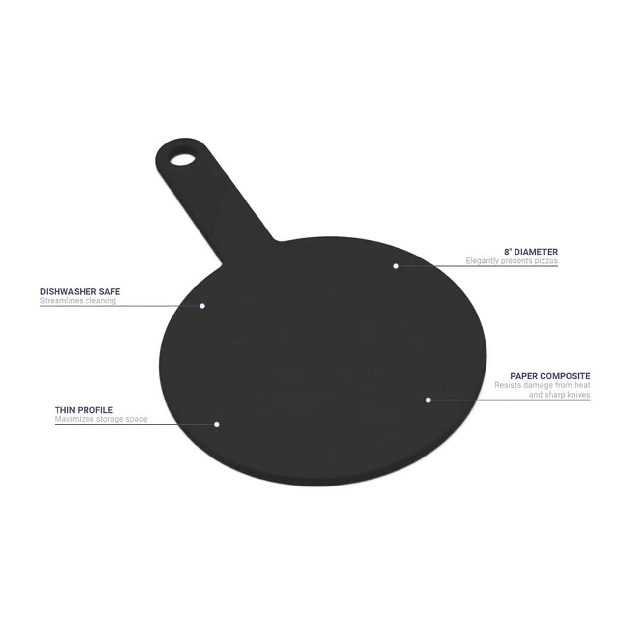 Combine style and function with this 13" pizza board featuring an 8" round blade and a 5" handle, crafted from durable, heat-resistant paper composite for easy serving and cleaning.