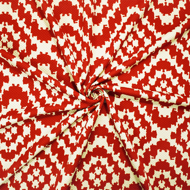 Add striking style to your next project with this 1-yard cut of Orange-Beige Abstract Diamond Bullet Knit Fabric. Featuring a textured waffle (bullet) knit surface and printed with a bold geometric diamond pattern in pumpkin orange and bone beige, this fabric offers both personality and functionality. Crafted from a blend of 97% polyester and 3% spandex, it provides moderate four-way stretch, full-body drape, and an opaque finish. Perfect for fashion-forward apparel, activewear, accessories, or stylish basics, this fabric is soft yet structured and machine washable.