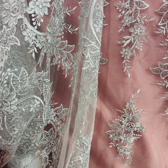 Elevate your special occasion creations with this premium corded bridal lace fabric embroidered on 100% polyester net mesh. Perfect for wedding dresses, evening gowns, quinceañera dresses, and dance costumes, it features intricate corded embroidery for a sophisticated and elegant look. Lightweight and versatile, this fabric is available in four refined colors, making it ideal for couture, decorative, and special occasion designs.