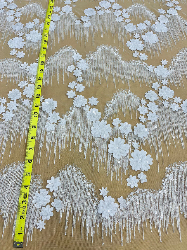 1 Yard Luxurious Beaded 3D Floral Lace Fabric Embroidered on 100% Polyester Net Mesh White