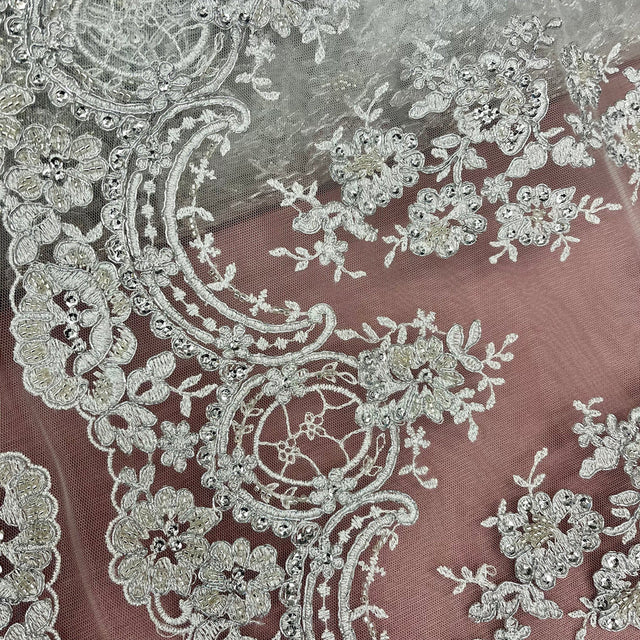 1 Yard Luxurious Beaded and Corded Bridal Lace Fabric Embroidered on 100% Polyester Net Mesh White - White / 51"Wide is backordered and will ship as soon as it is back in stock.