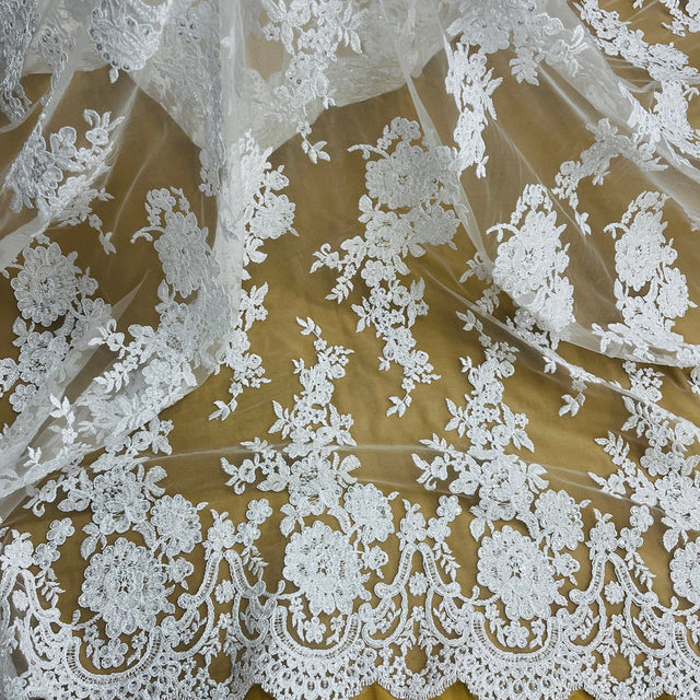 1 Yard Beaded Corded Bridal Lace Fabric Embroidered on 100% Polyester Net Mesh White