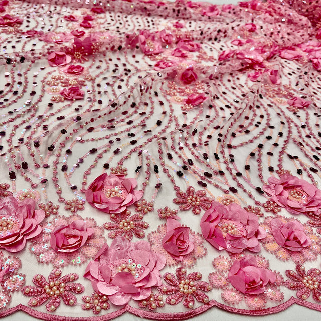 Create stunning couture designs with this beaded and sequined 3D floral lace fabric. Made on 100% polyester net mesh, it offers a sparkling, luxurious finish perfect for bridal gowns, evening dresses, quinceañera outfits, and dance costumes. Featuring intricate embroidery and eye-catching 3D floral details, this fabric adds elegance and sophistication to any project. Available in eight dazzling colors, its 52 inch width provides versatility for designing statement pieces or decorative accents.