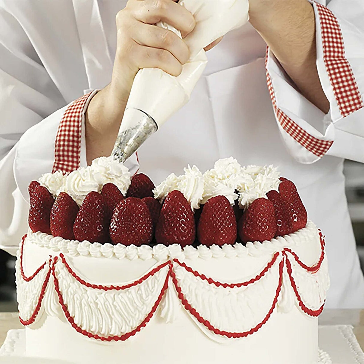 This 26-piece cake decorating set includes a variety of stainless steel piping tips, a standard coupler, and a metal flower nail, all housed in a convenient storage box. Designed for both professional bakers and enthusiastic decorators, the rust-resistant components offer lasting durability and precision for intricate pastry work.