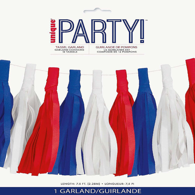 Bring bold color and festive spirit to your patriotic events with the 7ft Patriotic Paper Tassel Garland. Featuring vibrant red, white, and blue tassels, this garland is a perfect decoration for 4th of July, Memorial Day, or any USA-themed celebration. Crafted from high-quality paper, it's durable, lightweight, and easy to hang across walls, tables, mantels, and more. Reusable and eye-catching, it's the ideal way to showcase your patriotic pride at any gathering.