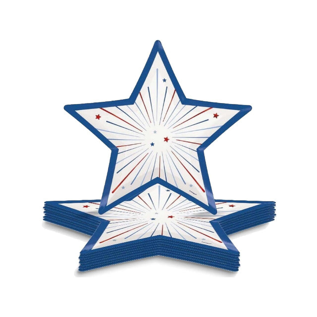 Add a festive and elegant touch to your 4th of July gathering or any USA-themed party with these Patriotic USA Star Shaped 9.25" Dinner Plates. Featuring a star shape and foil stamping, these plates bring both style and patriotism to your table. Ideal for serving your main course, these plates are made of durable material to hold even the heartiest meals. The pack of 8 ensures you have plenty of plates for all your guests. After your event, cleanup is quick and easy with these disposable plates.