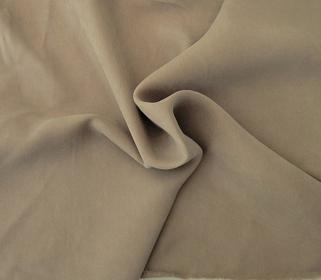 1 Yard of medium weight Putty Cupro Tencel Twill fabric featuring a soft sheen and elegant gabardine weave. Made from 100% Cupro Tencel, this eco friendly woven fabric offers breathability, hypoallergenic comfort, and a vegan alternative to silk. Its smooth texture and refined drape make it ideal for blouses, skirts, wide leg trousers, jumpsuits, scarves, scrunchies, and home décor accents like pillow covers and curtains