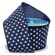 - Festive white stars printed on a crisp navy fabric ribbon.