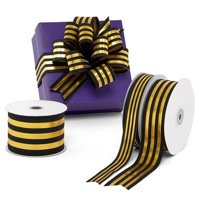 Vertical Striped Metallic Ribbon adds a touch of elegance to your projects with its high-shine gold panels and contrasting black fabric. Smooth and lightweight, this ribbon is perfect for making sleek bows and enhancing gift packaging or retail displays.