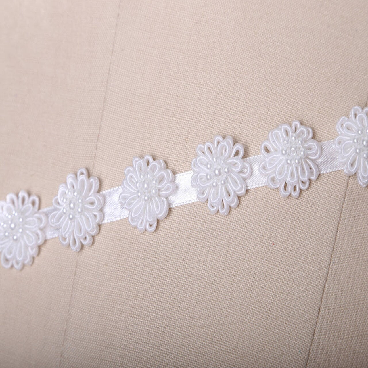 1 Yard of 3-dimensional firm white flowers set on a narrow matching satin ribbon. Perfect for adding elegant floral accents to garments, accessories, crafts, and home décor. Available in white and ivory. Ships in one continuous piece for multiple yard orders.