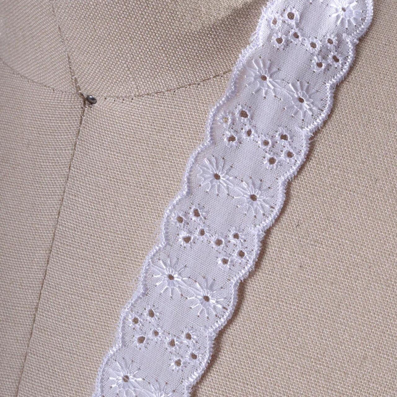 2 Yards of soft 100% cotton eyelet ribbon trim featuring double-sided finished scallops and delicate embroidered eyelet details. This 1" wide lace is ideal for enhancing baby clothes, children's dresses, skirts, light jackets, curtains, duvets, and table linens. Delivered as one continuous piece for multiple yard orders.
