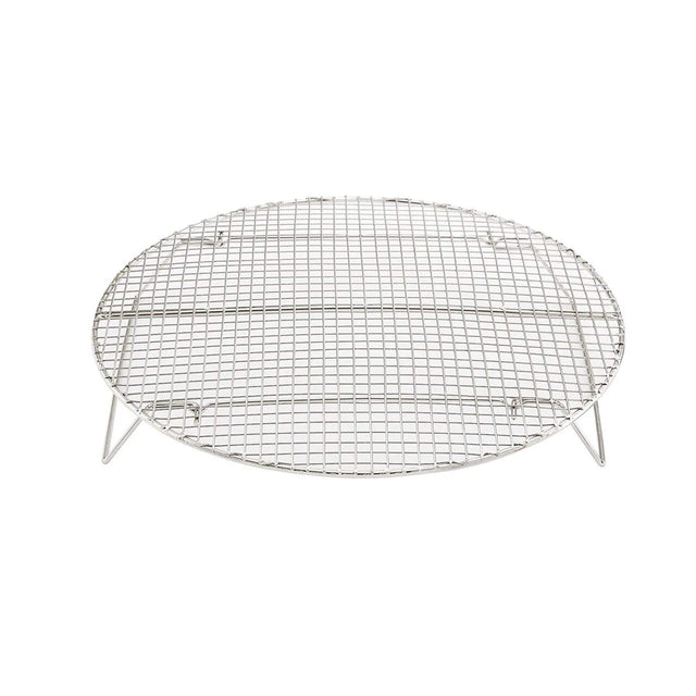 This round steamer rack features durable nickel-plated construction with built-in feet to elevate food for optimal steaming and drainage. Designed for efficient heat circulation, it is perfect for steaming vegetables, seafood, and other foods while preventing direct contact with water or steam. Its sturdy design ensures long-lasting performance in commercial and home kitchens.