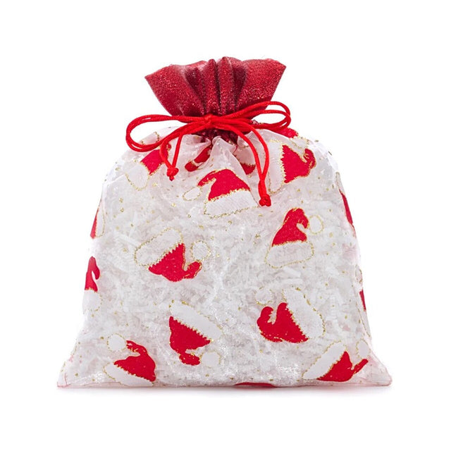 Celebrate the holiday season with the adorable White and Red Santa Hats Sheer Fabric Bag.