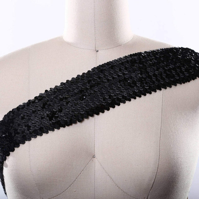Add glamour and sparkle to any project with this black stretch sequin trim. Featuring flat, shimmering sequins sewn together in a clustered design, this 3/4-inch wide trim is both flexible and eye-catching. Perfect for costumes, dancewear, and accessories like headbands, belts, and bracelets. Easy to sew onto most fabrics for bold, custom embellishments.