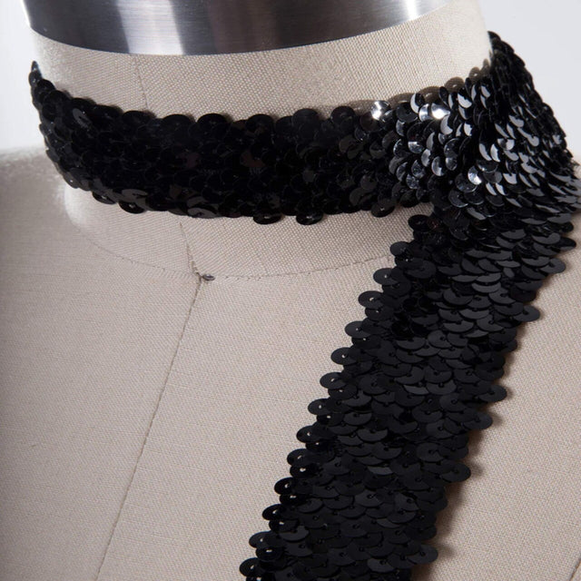 Elevate your designs with this 1.5-inch black stretch sequin trim. Made with flat, shimmering sequins sewn into a dense pattern, this elastic trim adds instant sparkle and drama to any piece. Ideal for stagewear, dance costumes, and fashion accessories like belts, cuffs, or headbands. Its flexibility and shine make it perfect for high-impact embellishment.