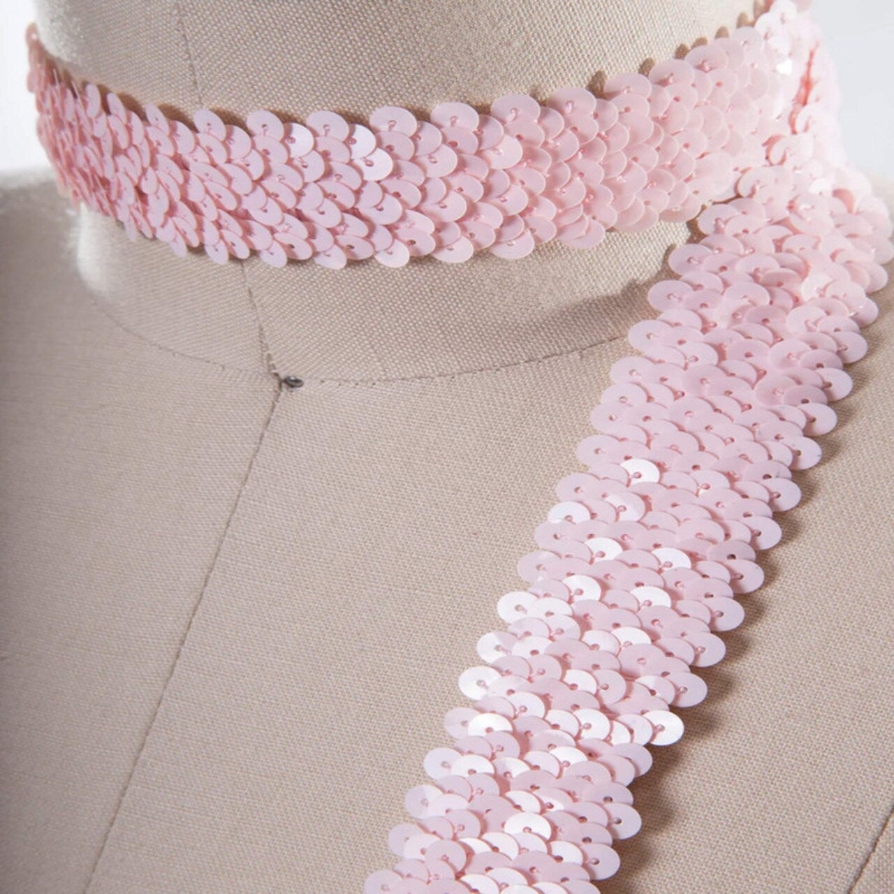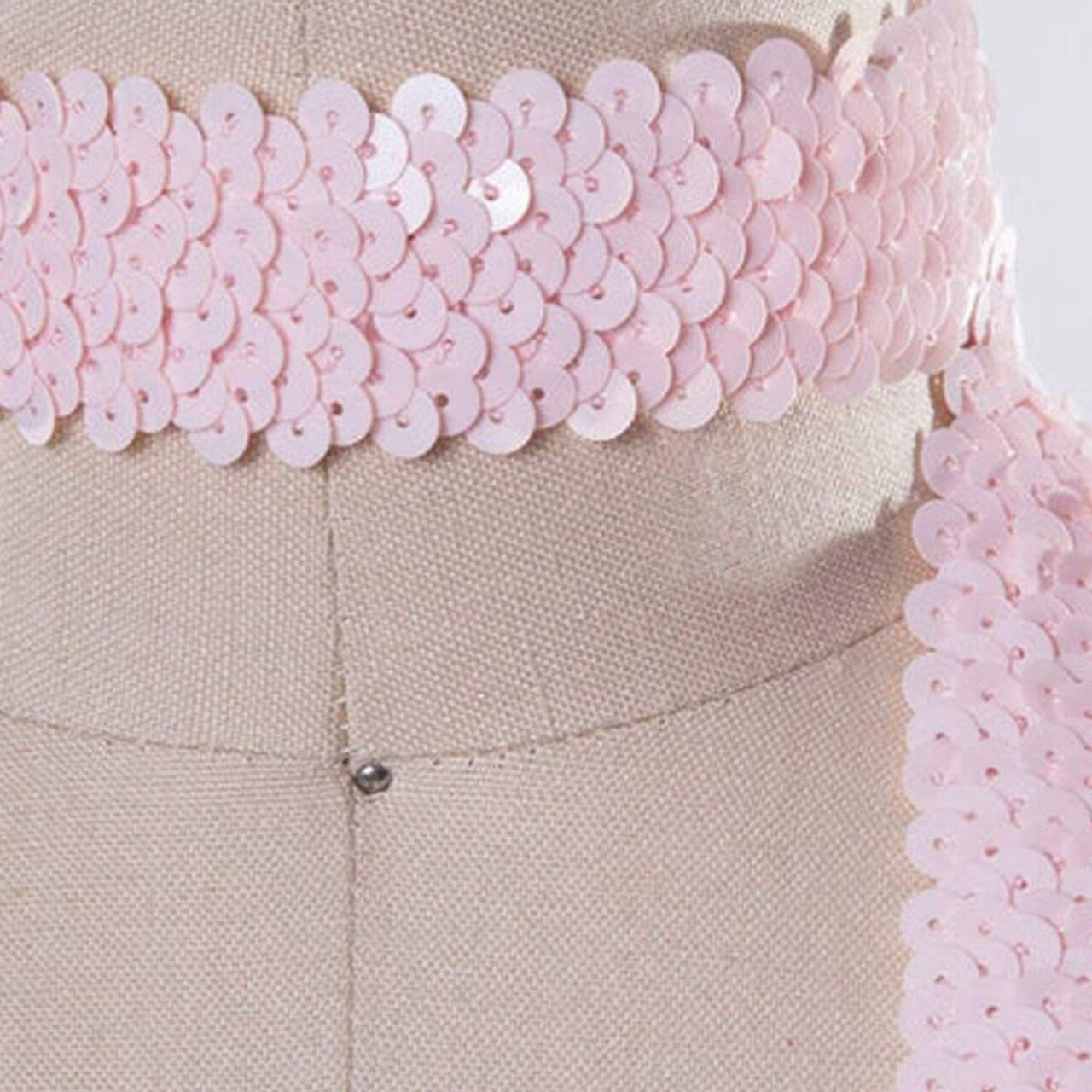 Add glamorous sparkle to your projects with this light baby pink stretch sequin trim. Designed with loose flat sequins sewn in shimmering clusters, this soft and flexible trim is perfect for delicate, elegant embellishments. Easy to sew onto most fabrics, it’s ideal for costumes, baby shower décor, dancewear, and accessories.