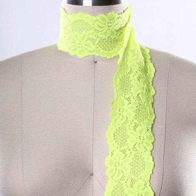 2.5" Wide Neon Yellow Stretch Floral Lace Trim Soft Hand-Dyed Elastic Ribbon for Lingerie, Overlays & DIY Crafts 2 Yards