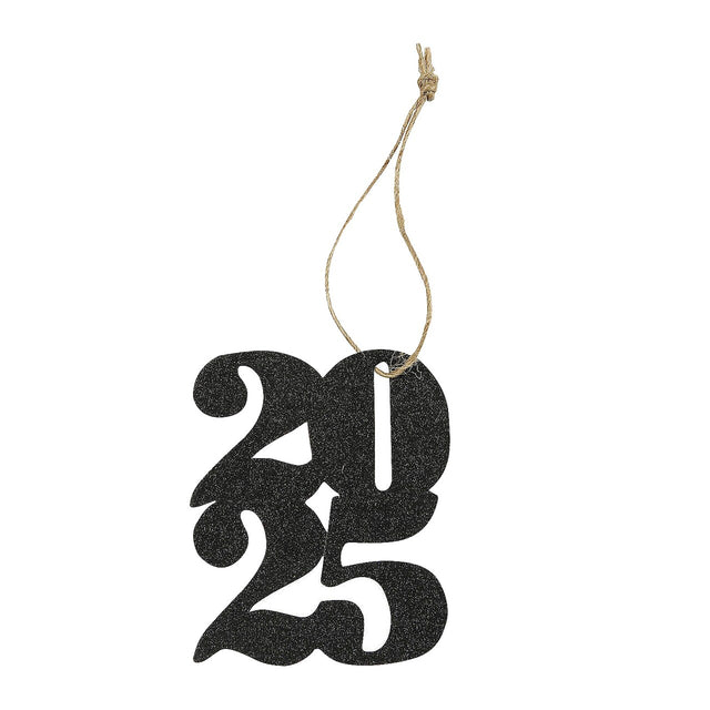 Features a stacked “2025” design with black glitter