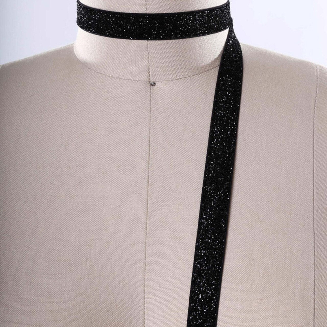Add sparkle to your creative projects with this black glitter elastic trim. You will receive 2 yards of 5/8-inch wide elastic with a glittery finish, perfect for creating striking headbands, hair accessories, or embellishments. Its stretchable material makes it ideal for both decorative and functional use.