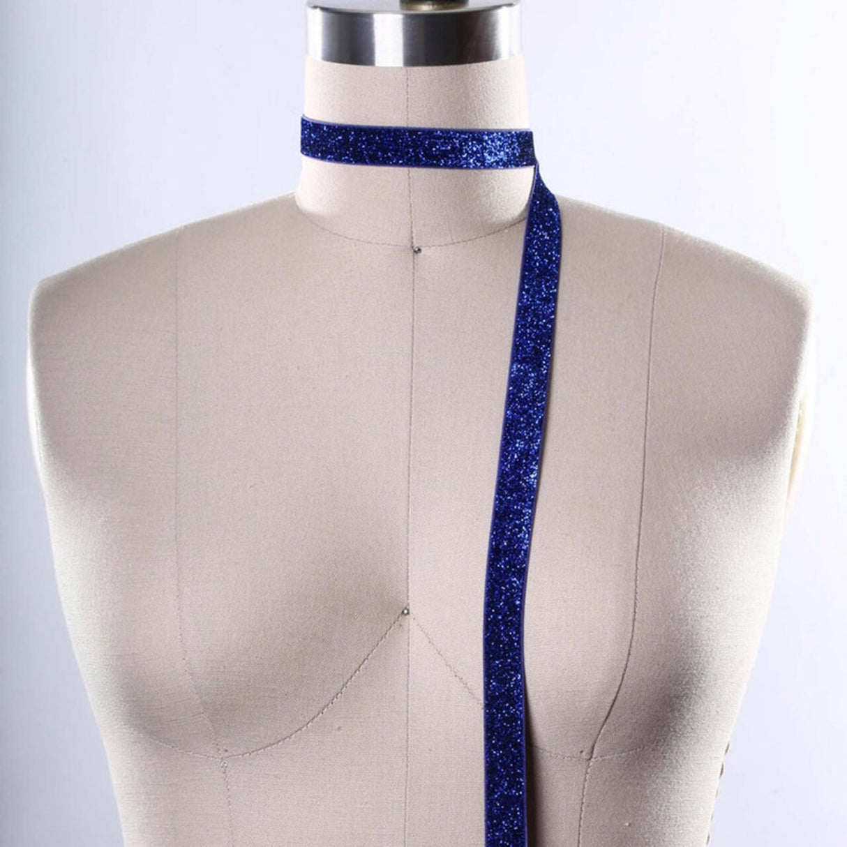 Add sparkle to your creations with this royal blue glitter elastic, available in 5/8" or 3/8" widths. With 2 yards per order, this rich and vibrant trim is perfect for making hair ties, headbands, party favors, and DIY fashion accessories. The elastic offers a smooth stretch and a dazzling shimmer that holds shape while looking stunning.