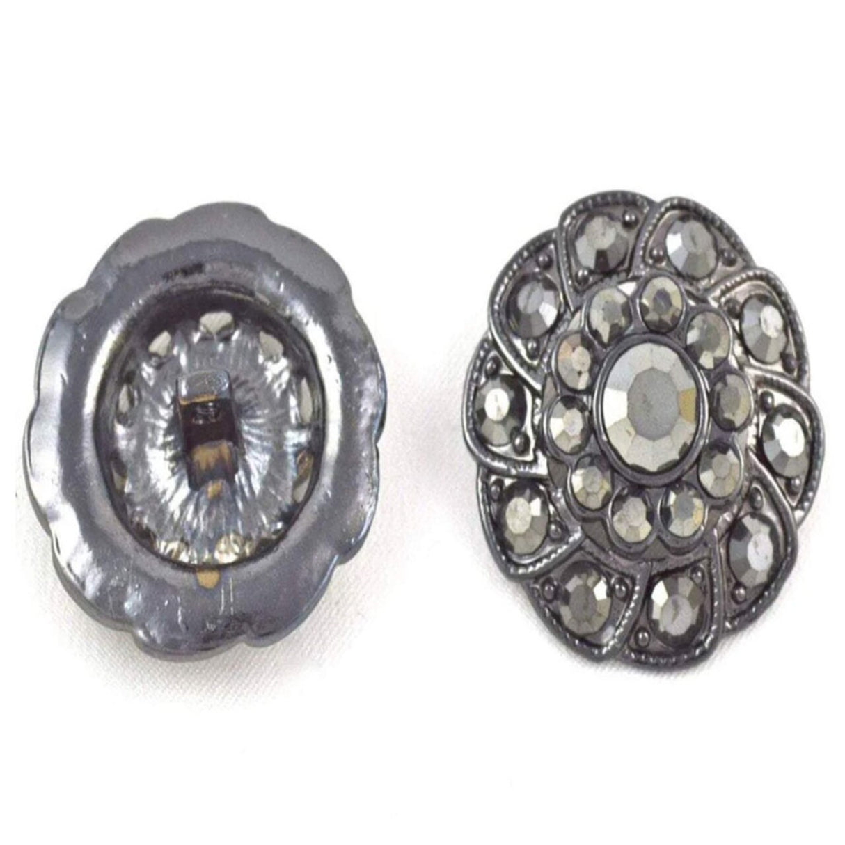 This elegant gunmetal button features classic-cut charcoal rhinestones set in a durable metal base with a metal shank backing. Perfect for enhancing garments, bridal bouquets, or accessories with a sophisticated sparkle. Designed for lasting quality and tested for durability. Size: 1 1/8"" (27mm, 44Ligne).