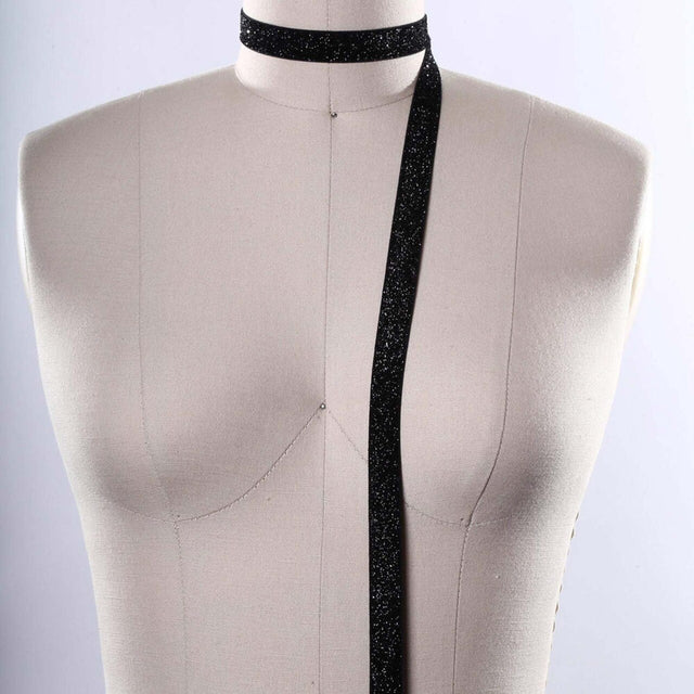 Add sparkle to your DIY projects with this black glitter elastic trim. This stretchy 5/8" wide elastic features glitter embedded for dazzling shine, perfect for hairbands, headbands, costumes, and more.