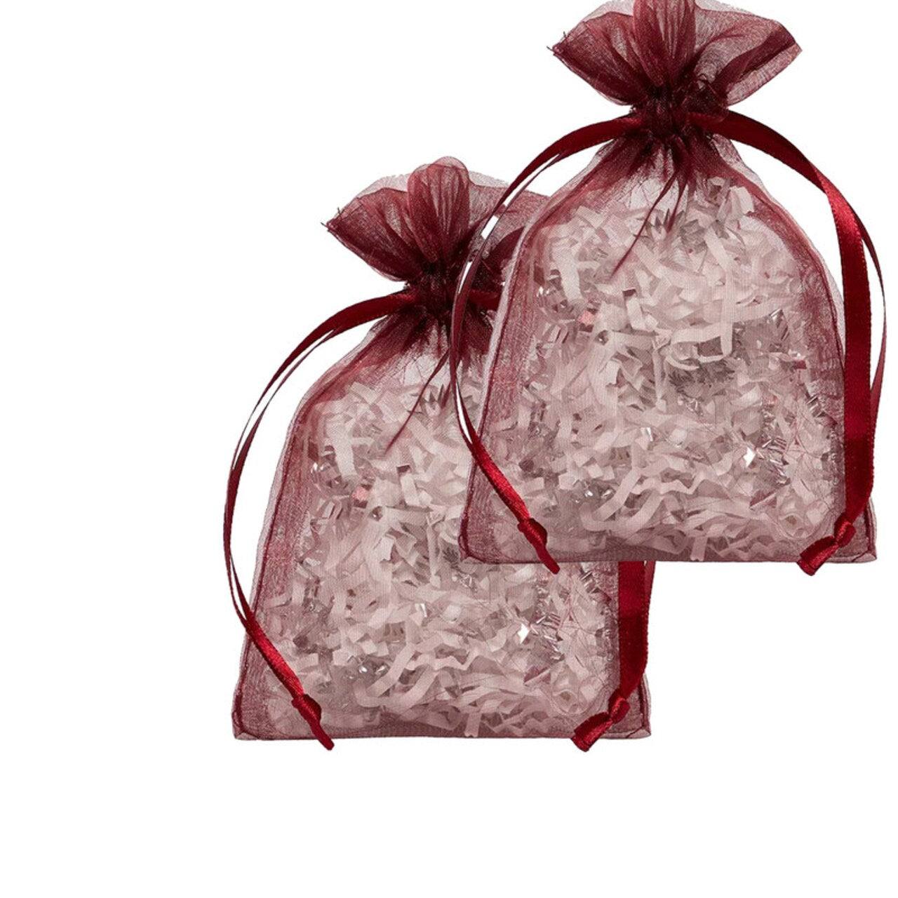 Standard Organza Bags (2" x 3") are a versatile and affordable choice for all your gift packaging needs. Perfect for wedding favors, party giveaways, or corporate gifts, these sheer bags beautifully showcase their contents. Designed with an envelope-style bottom to lay flat, each bag features a built-in satin double ribbon pull tie for secure and easy closure. The usable space below the ribbon pull is approximately 1" less than the total bag size. Handmade for a unique touch, these bags may have slight variations in size or color, adding to their charm.