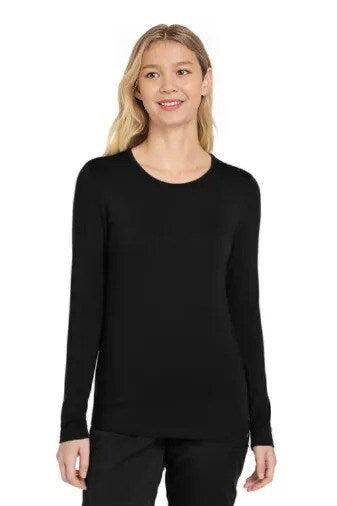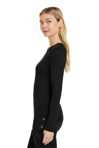 Crafted from a 96/4 rayon/spandex blend, this top offers a comfortable and flexible fit. Featuring a round neckline and a trim fit, it’s designed to be easily layered under scrub tops without adding extra bulk. The Wink® heat transfer logo at the hem adds a stylish touch to this functional garment.