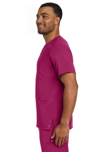 Crafted from a 78/20/2 poly/rayon/spandex blend, this scrub top features a V-neckline, shoulder badge loop, and a left chest pocket with a pen slot. It includes top-loading front pockets with a right interior pocket, side vents for enhanced breathability, and a Wink® heat transfer logo at the left hem. Designed with a modern fit, it offers comfort and utility for everyday wear.