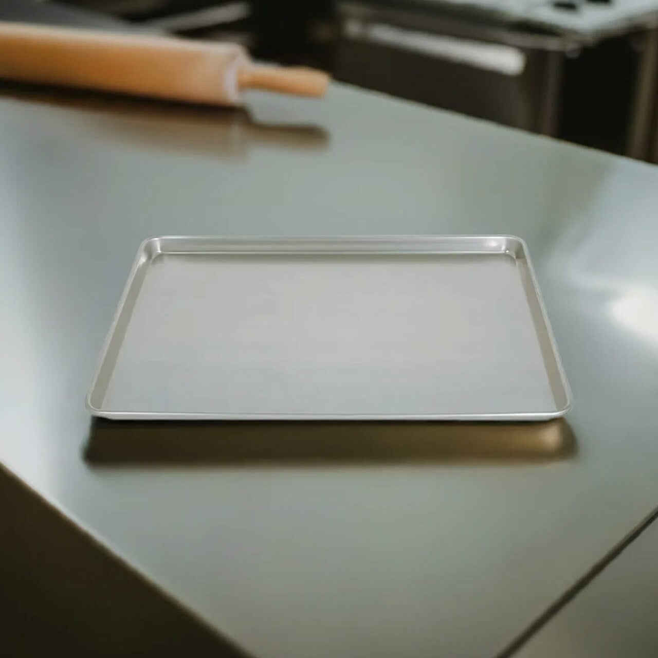 This full-size bun pan is crafted from heavy-duty 16-gauge aluminum for excellent heat distribution and durability. Measuring 18" by 26" with a 1" depth, it features a smooth, non-perforated surface and wire-reinforced edges to contain liquids. Its nesting design optimizes storage space, making it ideal for baking, roasting, and versatile food prep in busy kitchens.