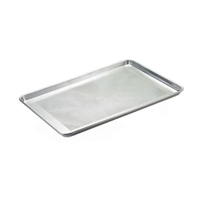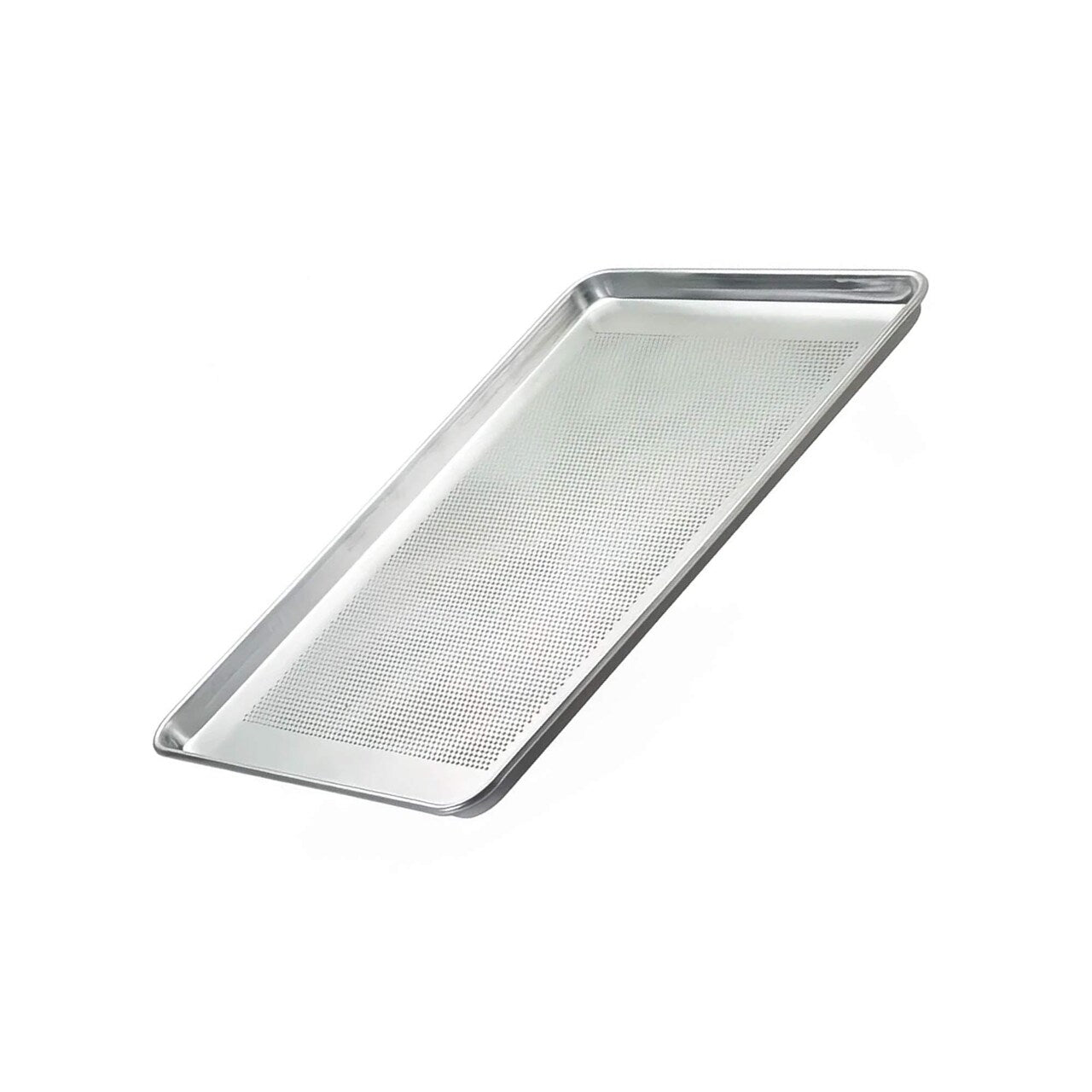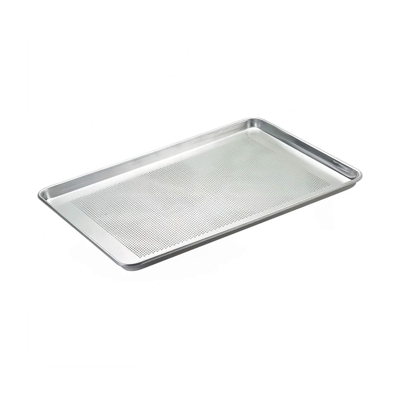 This full-size perforated bun pan is made from durable 18-gauge aluminum with a 1 mm thickness for strength and longevity. The wire-reinforced perimeter prevents warping, while the perforated bottom allows moisture drainage for crispier results. Stackable design with rounded corners optimizes storage, making it perfect for baking and roasting tasks in commercial kitchens.