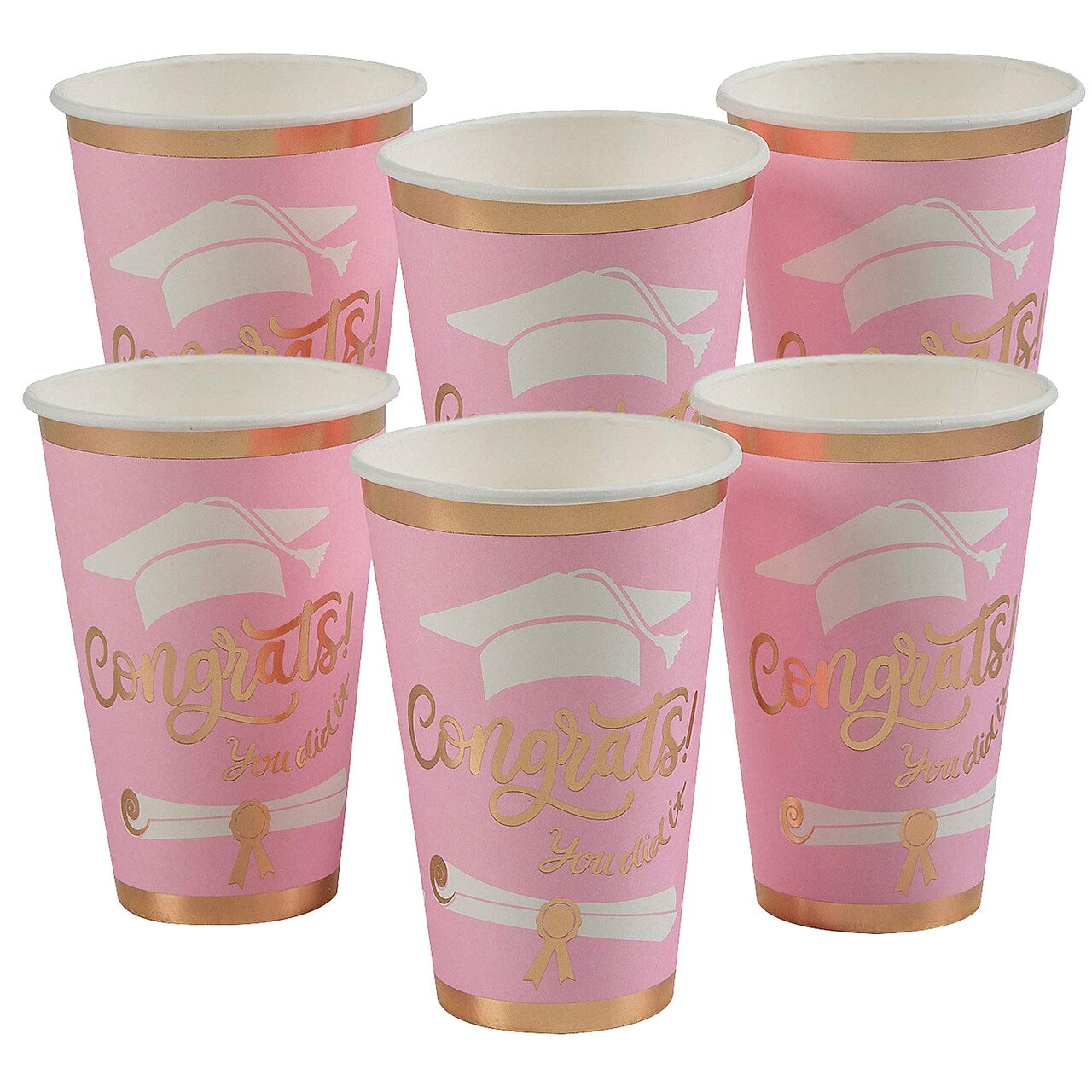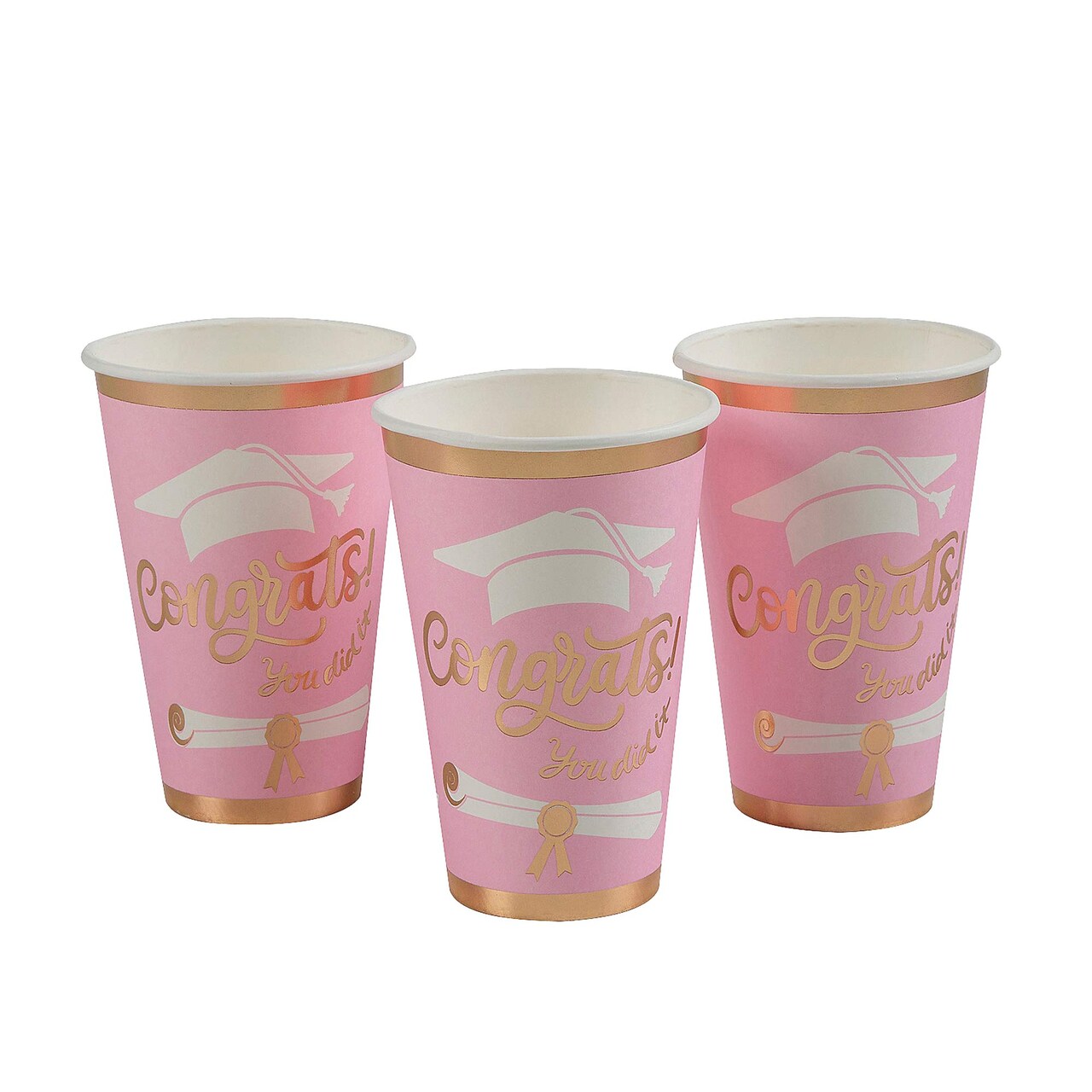 Celebrate your graduate’s achievement with these stylish Pink Congrats Graduation Cups! Adorned with cheerful "Congrats You Did It!" messaging, mortarboard and diploma graphics, and rose gold foil accents, these cups add a festive and elegant touch to your party. Perfect for serving punch, soda, and other beverages, these 16 oz. cups are not only practical but also a charming addition to your graduation celebration. Plus, they’re disposable for easy cleanup, so you can focus on enjoying the party!