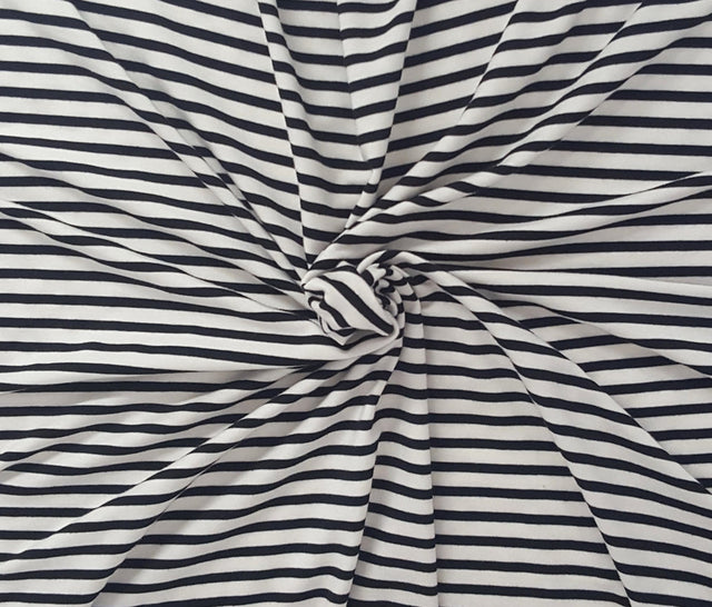 This 1/4 inch stripe jersey fabric combines ultra soft Tencel with flexible spandex in a classic black and off white pattern. Lightweight and breathable with 4 way stretch, this jersey is ideal for stylish, comfortable tops, dresses, loungewear, and layering pieces. The fine stripe offers a timeless, modern look while the drape makes it perfect for everyday fashion.