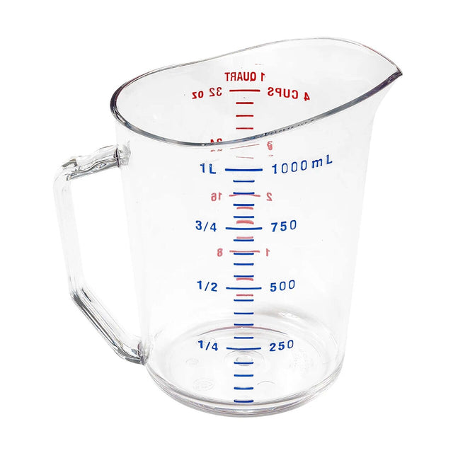 This 1-quart measuring cup features clear, durable polycarbonate construction with molded-in red (standard) and blue (metric) graduations for easy and accurate liquid measurement. The molded handle provides a secure grip, and it is dishwasher safe for effortless cleaning—perfect for busy commercial kitchens.