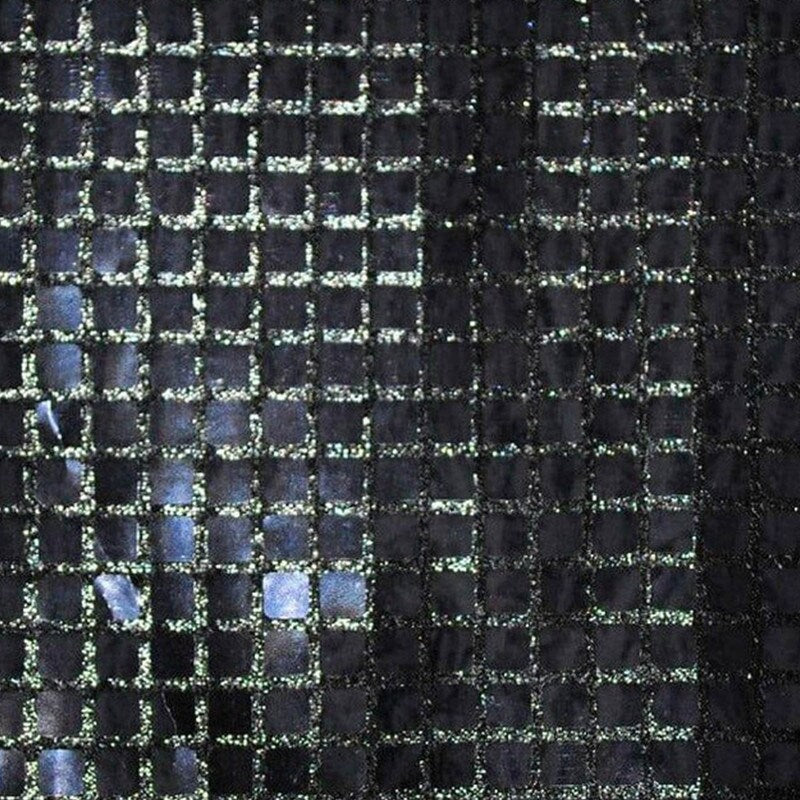 Square metallic sequins glued onto a polyester/metallic background for a brilliant shine