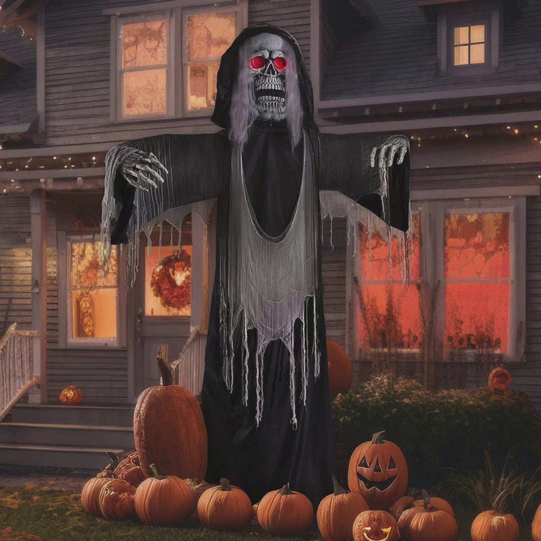 Bring ultimate thrills to your Halloween display with this towering 12 ft. Standing Grim Reaper. Cloaked and ominous, this animated decoration turns and pivots, creating a dramatic and eerie effect that captivates trick-or-treaters and party guests alike. Battery-operated for convenient setup, it’s perfect for front yards, porches, and Halloween events.