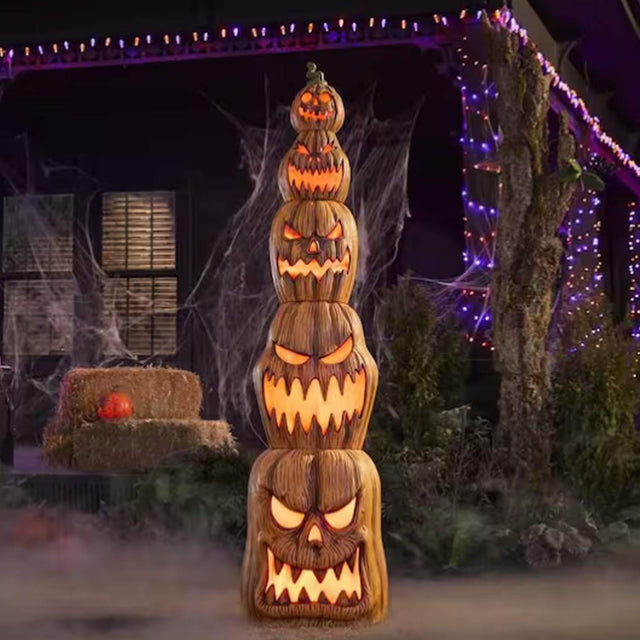 Make your Halloween decorations stand out with this 8.5 ft giant-sized LED jack-o-lantern stack. Featuring five stacked pumpkins with flickering LED faces, it can also be displayed horizontally like a festive pumpkin patch. Durable metal support ensures stability, and the included plug-in adapter has an ON/OFF/TIMER function for convenient use. Perfect for indoor or outdoor Halloween displays, this decoration combines fun, light, and holiday spirit.
