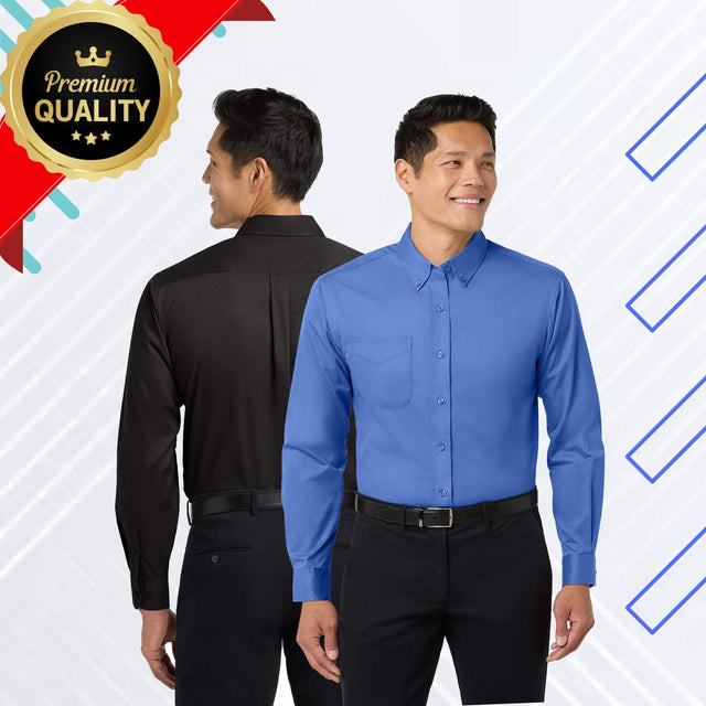 This Wash-and-Wear Cotton-Poly Work Shirt is a must-have for the workday, combining comfort, durability, and a polished appearance. Made from 4.5-ounce 55/45 cotton/poly fabric, it resists wrinkles and is easy to maintain. Features include a button-down collar, dyed-to-match buttons, left chest pocket, back box pleat, and rounded adjustable cuffs for a tailored, professional fit. Ideal for office, corporate, or uniform wear.