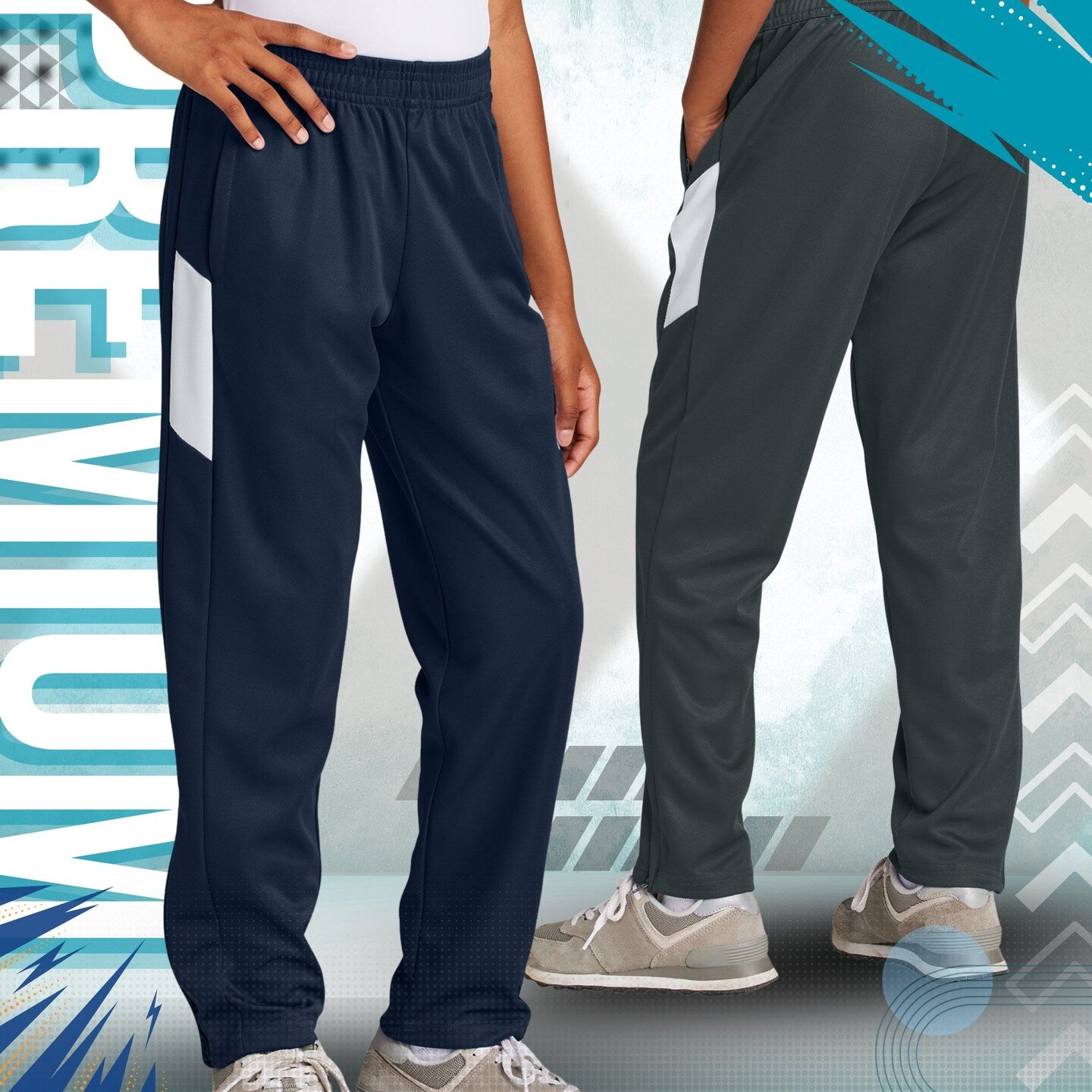 These youth travel pants combine comfort, performance, and team-inspired style for warmups, practice, or casual wear. Made from 100% recycled polyester double knit, they provide moisture-wicking durability and sustainable performance. The tapered leg design with extended side zippers allows for easy on/off, while side slash pockets offer convenient storage. With colorblock self-fabric detailing on the legs and a tag-free label for irritation-free wear, these pants are ideal for active kids.